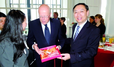 商城董事长叶凯(右一)向汉堡大学校长Dieter Lenzen先生(中)馈赠中国特色纪念品 |