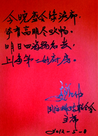 客人们听了开怀举杯,一饮而尽。魏纪中特意叫服务员取来纸笔,写道:“今晚盛会绿波廊,体育高朋尽欢畅,明日四海扬名去,上海第一好厨房!”然后签上自己的大名。 魏纪中留言完毕,像一位诗人般意犹未尽地即兴朗诵起来。 国际排联副主席Theofanis Tsioktis也提笔热情地书写了:“服务周到,美味佳肴!”八个大字,国际排联委员Anolie meyer高兴地写下:“在一个环境非常优美的餐厅,和好友品尝了佳肴。”……