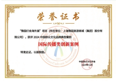 为深入贯彻落实党的二十届三中全会精神,以高质量发展创新引领群众文化工作,培育打造群众文化品牌,推动建立优质文化资源直达基层机制。2024年12月23日,在由中国群众文化学会、文化和旅游部全国公共文化发展中心、上海市文化和旅游局、上海市奉贤区人民政府主办的“2024群众文化品牌发展大会典型案例发布仪式”上,公布了2024中国群众文化品牌典型案例名单,共90个项目入选。其中,上海豫园旅游商城(集团)股份有限公司提报的“豫园灯会海外展”项目被评为国际传播类创新案例。