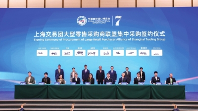 2024年11月8日上午,作为第七届进博会配套现场活动之一,上海交易团大型零售采购商联盟集中采购签约暨主题论坛在国家会展中心(上海)4.2H B2厅举办。上海市委常委、副市长华源,中国国际进口博览局纪委书记、国家会展中心(上海)副总裁宋尚哲,上海市国资委副主任姚汝林,上海市商务委员会二级巡视员李泓以及零售联盟会员和相关企业的采购签约代表、签约展商及品牌商代表等嘉宾出席活动。