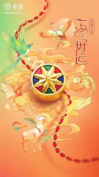 老庙一串好运全新系列,对应“福”、“禄”、“寿”、“喜”、“财”五运,分别选取寓意美好的传统元素,结合现代审美加以创新演绎,打造款式多样的黄金转运珠,并结合五种经典的东方色彩,呈现一系列配色灵动、兼具潮流时尚感与趣味性的新中式手饰,为年轻人带来“转”不停的好运祝福。