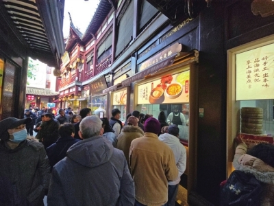 工作日的中午,坐落于豫园商城黄金广场的宁波汤团店内已然座无虚席,不少人站在收银台前一边点单一边等位,还有人拖着行李箱特意前来,想要尝一尝这份上海元宵节的传统美食。