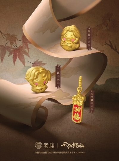 于7月15日正式发售的新品老庙×《天官赐福》动画联名系列,巧妙融合动画中具有辨识度的核心元素,打造黄金手绳、转运珠、金钞、御守等新品,满足喜欢古风的泛二次元年轻人群对IP周边的收藏需求。