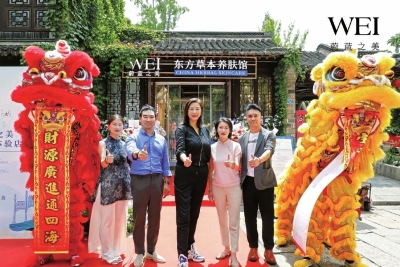 WEI蔚蓝之美南京店内根据目前的生意模式,精选品牌旅行装、南京老门东限定礼盒及东方生活美学衍生品,为消费者呈现一场跨越时空的草本养肤之旅。豫园股份副总裁陈晓燕女士、豫园化妆品集团总裁助理、WEI蔚蓝之美总经理潘菁女士、豫园美丽健康集团战略部总经理阙振元先生、豫园美丽健康集团CHO郭娟女士和WEI蔚蓝之美品牌副总经理蔡青先生为新店剪彩揭幕。
