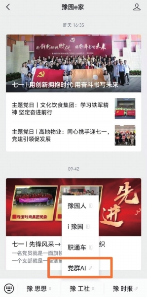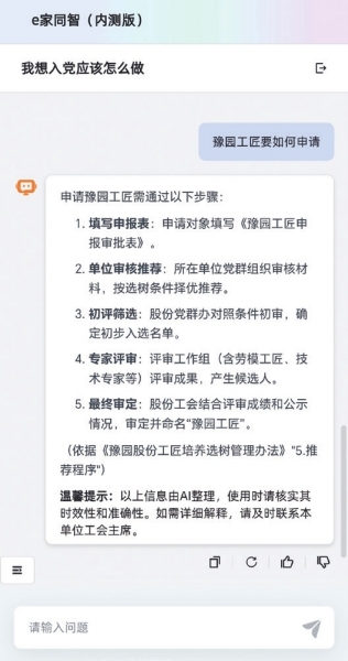 目前,“e家同智”党群AI智能体已在“豫园e家”微信公众号上发布“内测版”运行。使用时,打开公众号界面,点击“豫工社”栏目,找到“党群AI”,点击即可使用体验。