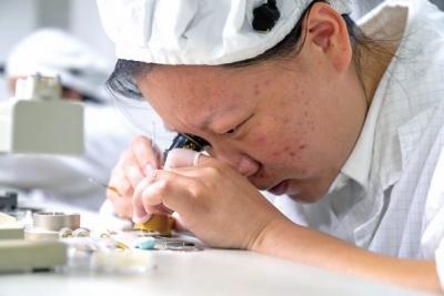 工作之余,李玲也在不断学习,“时代在发展,技术在进步,市场需求在变化,要紧跟时代。”通过引入先进设备、仪器,来达到降本增效。比如原先为轮系加机油的量很难掌控,新人手生有时候还会造成损坏报废。李玲让新人使用电子放大镜,可以更清楚的观察油量,使得新人也能很快掌握好加油的量。同样,通过电子显微镜,可以更直观地观察零件找到问题,提高修表的效率。今年AI的横空出世对很多行业都造成了不小的冲击,但对手艺活影响甚少,李玲觉得先进的技术都值得学习,是工作很好的帮手,可以帮助提高工作效率。