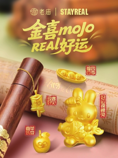 老庙与创意潮牌STAYREAL跨界携手,将STAYREAL旗下IP“MOJO FAMILY”中灵动潮趣的元素形象与老庙“好运基因”相融合,以“金喜MOJO,REAL好运”为主题,打造兼具时尚表达与好运寓意的联名系列产品。